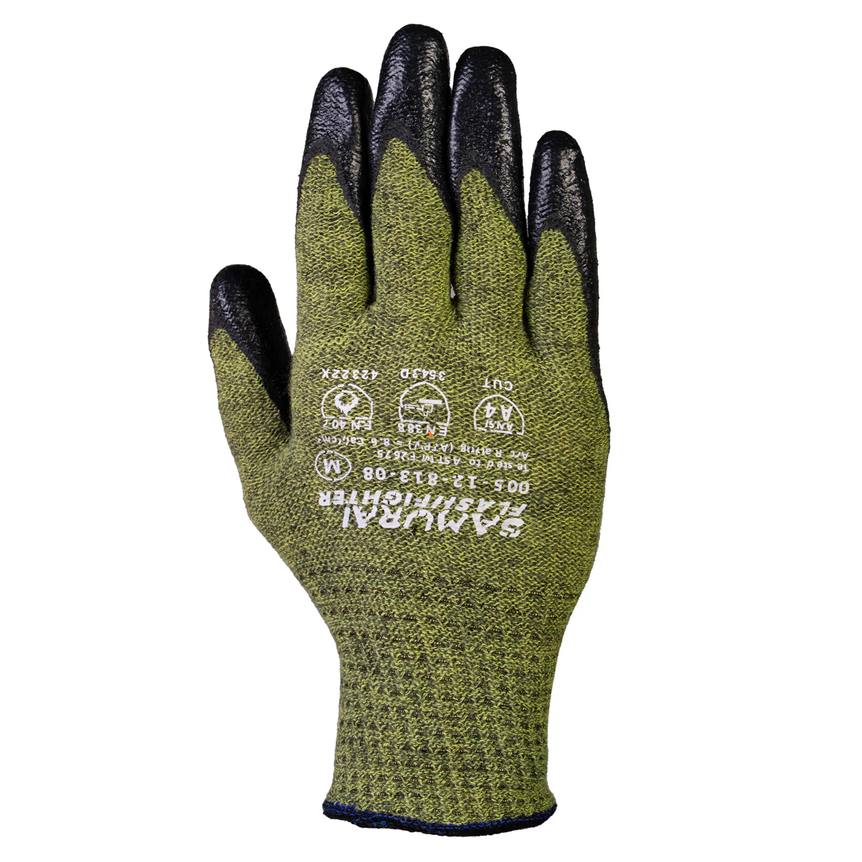 Introducing the "Samurai Flashfighter" Cut A4/Arc Flash 2 High-Performance Work Glove. Featuring an aramid-based composite liner and proprietary coating for superior comfort, grip, and flexibility. With excellent resistance to oil, grease, and glue, plus a Heat Attenuation Factor (HAF) of 69%.